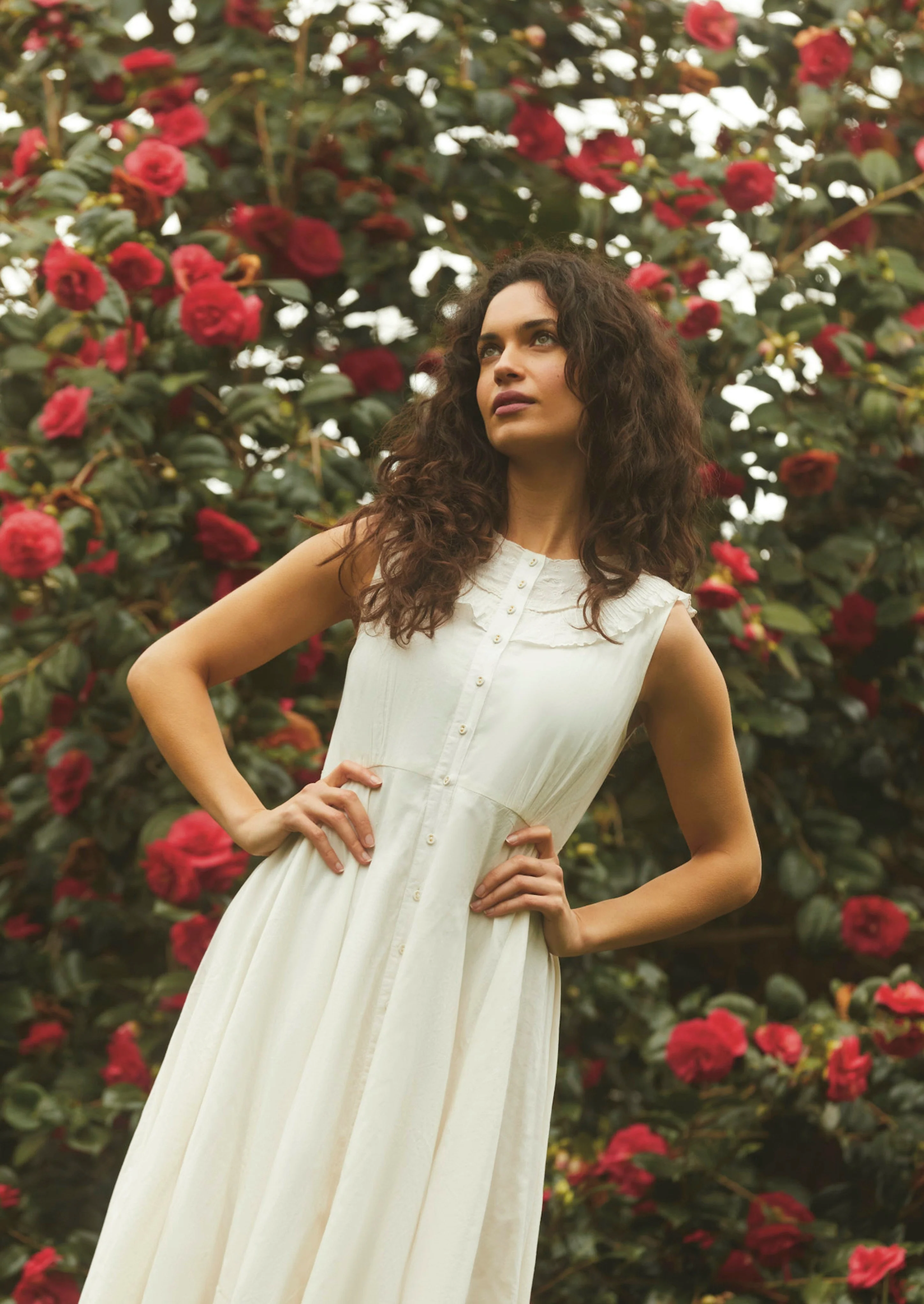 With Edwina we sought to design a shirt dress with a vintage nod that felt modern, easy & pretty. Sleeveless with a volumous circle skirt & optional belted waist, this dress features the most delicate antique-inspired floral embroidered yoke & hand-sewn pintuck collar, finished with a mini scallop at the neckline and skirt hem.