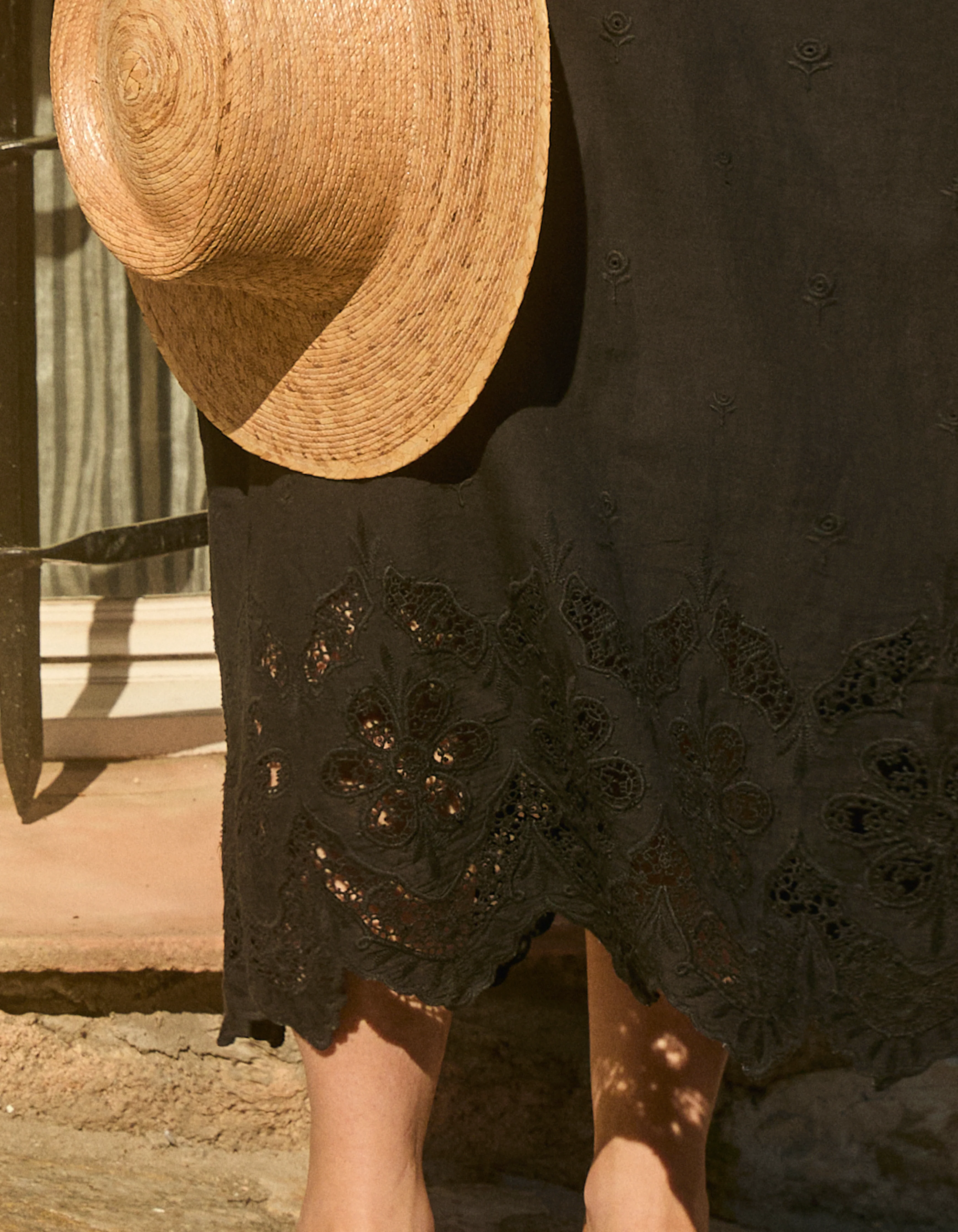 Lilah is our first broderie anglaise sun dress. We created a bespoke embroidery for this style, featuring a simple flower over the body of the dress, flowing into a beautiful framed floral lace with a deep scallop edge.