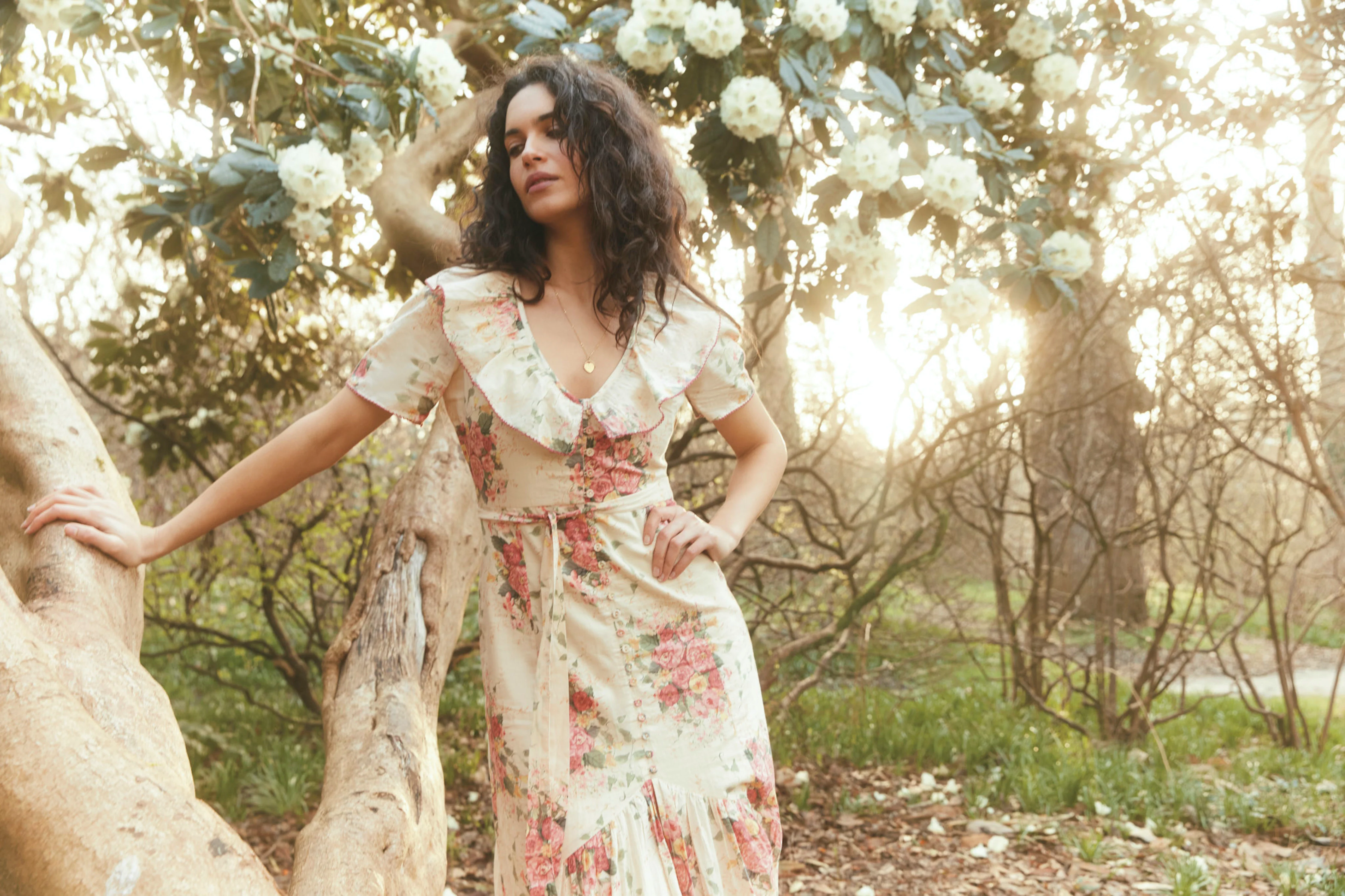 Cut in the softest lightweight organic cotton, this dress is lined to the kissing split of the skirt, with a belt which can be tied prettily at the back or clinched at the front.